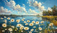Dit betoverende, trendy kunstwerk is een olieverf schilderij dat de serene schoonheid van de natuur uitbeeldt met een veld van madeliefjes aan de oever van een rustig meer.