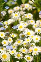 Een foto van een veld met Madeliefjes. Er staan ook een paar blauwe Vergeet-me-nietjes tussen. Ik laat altijd een stuk grasveld over aan de Madeliefjes omdat ik die zo vrolijk vind. Een typische voorjaarsbloem. Eindelijk weer lente.