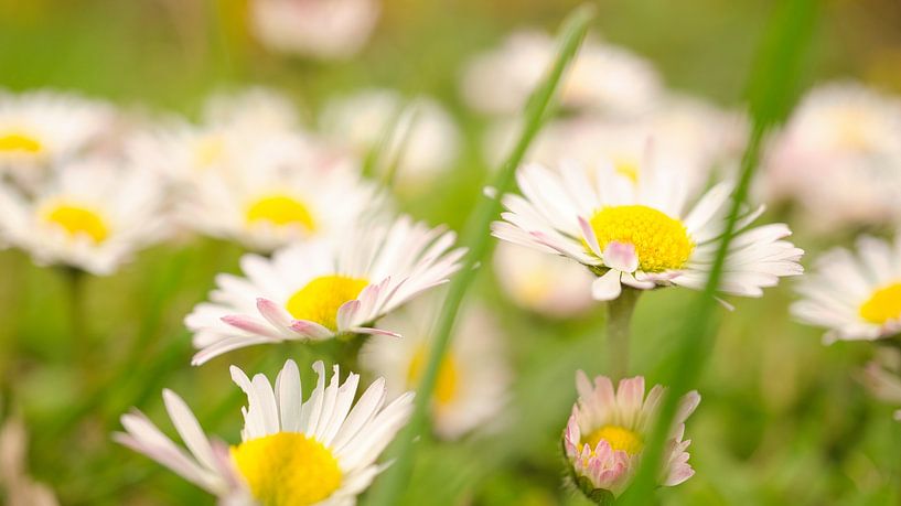 Madeliefjes in een groene weide. Witroze bloemen met groene bladeren. Vroege zomerbloemen.