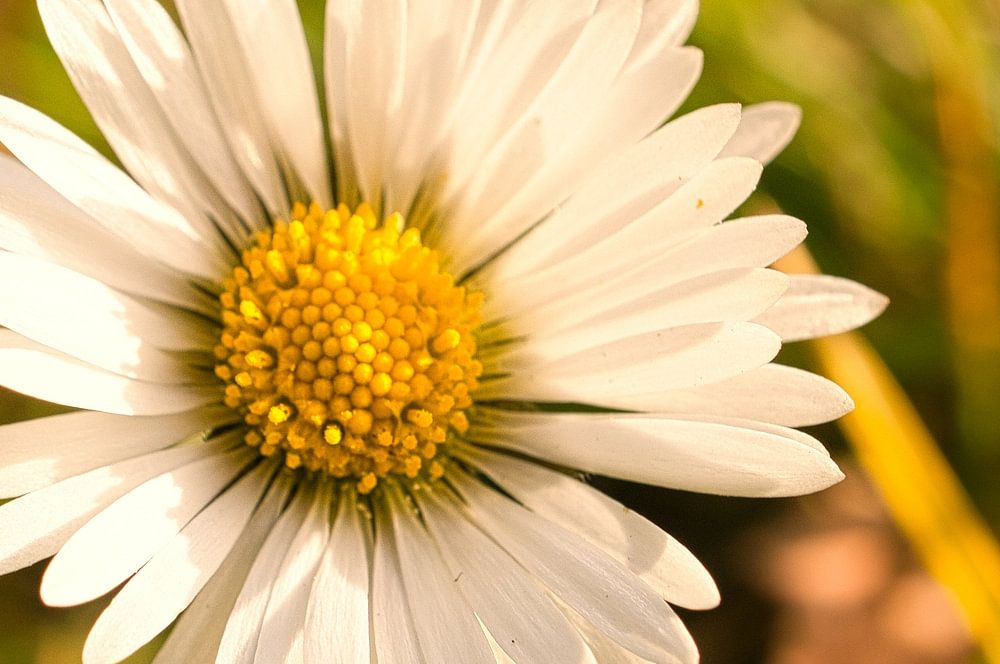 Madeliefjes in een groene weide. Witroze bloemen met groene bladeren. Vroege zomerbloemen.