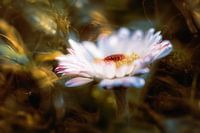 Macrofoto van een madeliefje in de lentezon. De mystieke achtergrond is bereikt door een camera-interne meervoudige belichting.