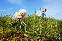 Fubby poppetjes die madeliefjes plukken in het gras. Margriet bloempjes die romantiek uitstralen en liefde voor elkaar.