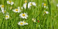 Madeliefje, lieveheersbeestje op een grasspriet in de tuin.