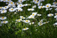 Een brede weide, dicht begroeid met ontelbare madeliefjes. De witte bloemhoofdjes met een geel hart zetten duidelijke accenten op het weelderige groene gras.