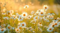 De laagstaande zon verlicht de scène met een zacht, goudgeel licht dat de witte bloemblaadjes laat oplichten tegen de vage groene achtergrond. De gele hartjes van de madeliefjes lijken net kleine zonnetjes die verspreid zijn over…