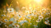 De zonnestralen banen zich een weg door de bloemen en creëren een sprookjesachtige sfeer met warme, gouden tinten die over het hele veld worden verstrooid. Druppeltjes dauw zijn zichtbaar op de bloemblaadjes, die fungeren als prisma's en de lichtstralen breken in subtiele regenboogkleuren. De madeliefjes steken met hun helderwitte bloemblaadjes en goudgele hartjes levendig af tegen de groene achtergrond. Het licht speelt door de bloemen en bladeren heen, wat resulteert in een dynamisch spel van licht en schaduw.