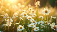 De bloemen steken helder af tegen het verzadigde groen van de weide, met hun kenmerkende witte bloemblaadjes en gele harten die stralen in het zachte zonlicht. De zon creëert een sprankelende bokeh op de achtergrond, wat het geheel een dromerige en bijna magische uitstraling geeft. De sfeer is rustgevend en straalt een natuurlijke eenvoud uit. De madeliefjes lijken mee te bewegen met een zachte bries, wat een dynamisch element toevoegt aan het anders stille tafereel.