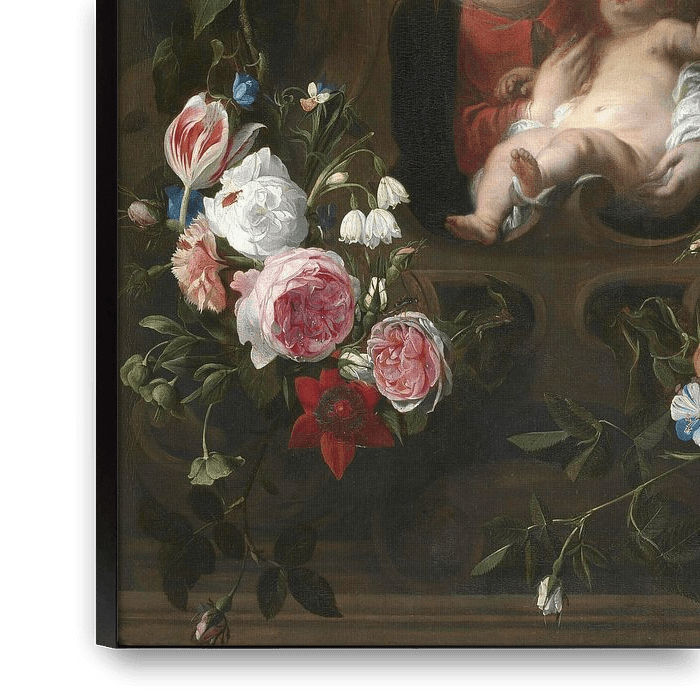 De formule van een madonna in een bloemenkrans werd in de Vlaamse schilderkunst geïntroduceerd door Jan Brueghel I en Peter Paul Rubens. Na Breughel was de jezuïet Daniël Seghers ongetwijfeld de belangrijkste bloemenschilder in de Zuidelijke Nederlanden. De pater-kunstenaar hield een geschreven lijst bij van 239 eigenhandig geschilderde stukken. Daarvan werden er verschillende besteld als diplomatieke geschenken. Het hier getoonde schilderij realiseerde Seghers in samenwerking met de historieschilder Cornelis Schut I, die vooral bekend is voor zijn grootschalige, weelderige composities.