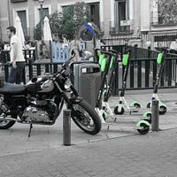 Koop de foto Madrid - Motor en limescooter van Wout van den Berg op canvas, aluminium dibond, (ingelijste) fotoprint, behang en ArtFrame, op maat geprint in Fine-Art kwaliteit.