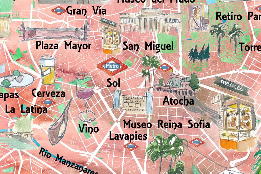 Madrid Spanje Geïllustreerde reiskaart met wegmarkeringen en toeristische hoogtepunten