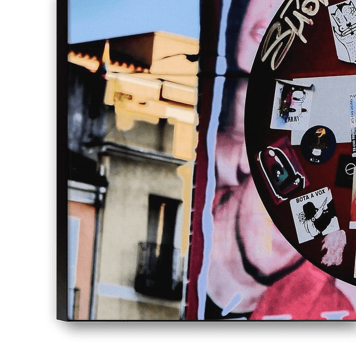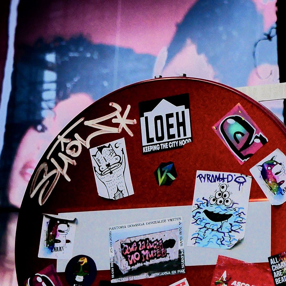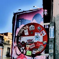 Madrid - Stopbord beplakt met verschillende band logo stickers