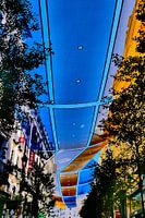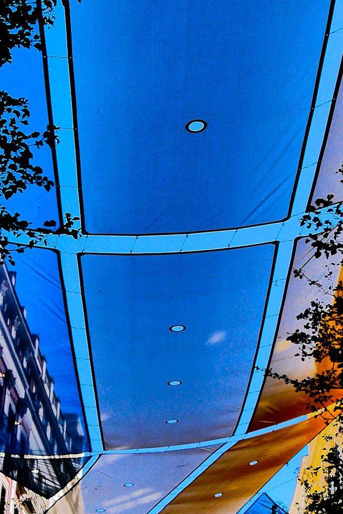 Madrid - Doeken gespannen over een straat met een strakke blauwe hemel erachter. De kleuren wat feller aangezet voor mooi effect