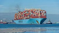 Maersk containerschip onderweg naar open zee onder begeleiding van 2 sleepboten.