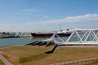Nr Hoek van Holland The Netherlands The Maeslantkering, part of the Europoortkering flood defences of the Delta Works. One of the largest manmade moving structures on earth. Oil Tanker Ridgebury Rosemary E passing along the Nieuwe Waterweg.