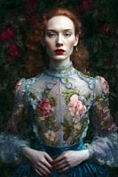 Impressionistisch portret van een vrouw met rood haar, ze draagt een kanten renaissance stijl jurk met bloem borduursel.