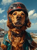 Mag ik uw rijbewijs zien? Humoristisch portret van een hond met helm op, op een motor. Een echt bijzondere blikvanger voor je interieur! Golden retriever.