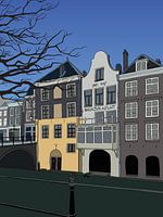 Verder in de diepte tekenen zich nog drie grachtenpanden af, kleiner en iets minder gedetailleerd, wat perspectief en schaal aan het kunstwerk toevoegt. Het geheel ademt eenvoud, balans en een vleugje nostalgie, gevangen in een helder, gestileerd beeld dat de essentie van de plek viert.
