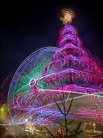 Het reuzenrad naast het stadhuis is een bijzondere favoriet - en samen met de kinderdraaimolen als nieuwe attractie zorgt het voor een betoverend fotomotief. In deze opname zijn beide attracties in beweging en zijn ze gefotografeerd met een lange belichtingstijd.