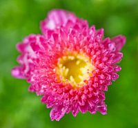 Magenta chrysanten - een prachtige halfgeopende chrysantenbloem helder magenta en geel. De bloem is nat van de regen. De achtergrond is een zachte rand middengroen. Het uitzicht is in vogelperspectief en kijkt neer op de bloem. De chrysanten symboliseren vriendschap, geluk en welzijn.