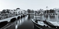 Zwart-wit foto Ophaalbrug Magere Brug, een Nederlandse brug in het historische centrum van Amsterdam over de rivier de Amstel, en een woonboot bij nacht, Amsterdam, Nederland