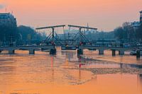 Prachtige winterochtend in Amsterdam, Nederland, met zicht op Magere Brug en Amstel met ijs.