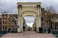 Dit werk zoomt letterlijk in op de Magere brug in Amsterdam. De brug dateert uit 1934 en heeft zijn naam te danken aan zijn voorganger die metterdaad een smalle (magere) brug was. Aan weerzijden van de brug zien we de prachtige grachtenpanden met hun verschillende gevels. Midden op de brug fietst een mevrouw en er loopt een jongeman, beide gezien op de rug. In het verlengde van de brug loopt de Kerkstraat. Op de verre achtergrond de toren van het Rijksmuseum te zien. Dit werk is zowel in kleur als zwart-wit verkrijgbaar.
