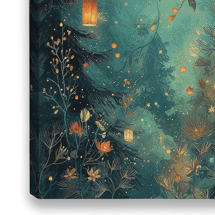 Een kunstwerk waarin gloeiende lantaarns als gouden druppels tussen knotwilgen en sparren hangen, omringd door warme sterren, parels en natuurlijke elementen. De teal-groene atmosfeer creëert een dromerige, serene wereld waarin licht en natuur elkaar ontmoeten in perfecte harmonie—een visueel manifest van hoop, rust en poëtische wonderen.