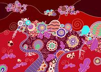 De magical mountains zijn net als de 'Wonderland adventures' serie al droedelend getekend met de hand en daarna digitaal ingekleurd. Zo combineer ik mijn jeugdliefde voor het gedachtenloos fantaseren van figuren met het gemak van spelen met kleurpaletten. Wat meer of minder verzadiging, wat meer of minder verschillende tinten, koele kleuren, warme kleuren... de sfeer van de afbeelding wordt er direct door beïnvloed. Laat je meevoeren in dit dromerige landschap.