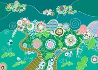 De magical mountains zijn net als de 'Wonderland adventures' serie al droedelend getekend met de hand en daarna digitaal ingekleurd. Zo combineer ik mijn jeugdliefde voor het gedachtenloos fantaseren van figuren met het gemak van spelen met kleurpaletten. Wat meer of minder verzadiging, wat meer of minder verschillende tinten, koele kleuren, warme kleuren... de sfeer van de afbeelding wordt er direct door beïnvloed. Laat je meevoeren in dit dromerige landschap.