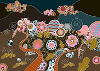De magical mountains zijn net als de 'Wonderland adventures' serie al droedelend getekend met de hand en daarna digitaal ingekleurd. Zo combineer ik mijn jeugdliefde voor het gedachtenloos fantaseren van figuren met het gemak van spelen met kleurpaletten. Wat meer of minder verzadiging, wat meer of minder verschillende tinten, koele kleuren, warme kleuren... de sfeer van de afbeelding wordt er direct door beïnvloed. Laat je meevoeren in dit dromerige landschap.