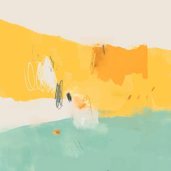 A composition full of vibrant color and dramatic tension. Vivid yellow contrasts with mint green, while central white scribbles and dark shadows suggest a surprising magical moment—bright, cheerful, and mysterious.