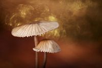 Twee paddenstoeltjes lijken te dampen tegen een achtergrond van herfstbladeren. Dit effect ontstaat door het schijnen met een lampje tegen een reflectiescherm achter de paddenstoelen zonder Photoshoptrucs!