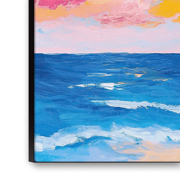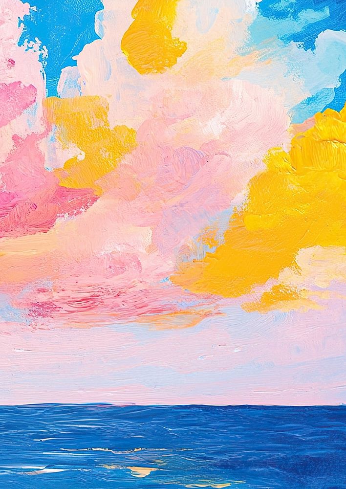 Abstract olieverfschilderij met roze en gele wolken in de lucht, een blauwe oceaan, een horizonlijn, een helderblauwe lucht en de zon die door de wolken schijnt, die een zomerse stemming oproept