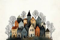 Een charmante illustratie van een intiem dorpsgezicht, waar huizen in zachte aardetinten en grijsblauwe kleuren dicht op elkaar staan op een glooiende heuvel. De kale winterbomen omlijsten de verschillende hoogtes en vormen van de huizen, waarbij één gebouw met een sierlijke torenspits boven de andere uitsteekt. De minimalistische stijl en het gedempte kleurenpalet creëren een sfeervolle, bijna sprookjesachtige stemming.