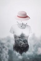 Deze betoverende afbeelding toont een mysterieus, wazig landschap dat een gevoel van droomachtige verwondering oproept. In het midden van de scène zweven een wit T-shirt en een hoed, die samen de illusie van een onzichtbare persoon creëren. Het T-shirt is bijzonder doordat het een doorgang lijkt te vormen naar het prachtige dennenbos…