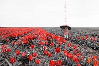 In een magisch tafereel staat een tweejarig meisje met een zwarte paraplu in een uitgestrekt tulpenveld. Ze draagt een roze jas en felrode laarzen, die opvallend contrasteren met het monochrome landschap om haar heen. Het meisje, stralend van levendigheid, vormt een kleurrijk contrast met de zwart-witte wereld van het tulpenveld.