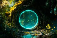 Een magisch portaal dat midden in een betoverd bos opengaat, ontvouwt mysterieuze lichtspelingen en fonkelt met geheimzinnige vuurvliegjes. De levendige groentinten en de aura-achtige gloed geven de kamer een dromerige sfeer. Perfect voor een woonkamer of een creatieve studeerkamer die de verbeelding prikkelt en uitnodigt om te dromen.