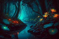 Magisch fantasiebos bij nacht met gloeiende bloemen en pad