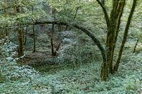 Uitzicht op een fascinerend bos in de Franse Jura - de gebogen boomstam vormt de poort naar een andere wereld.
