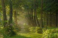 Bos met invallend zonlicht en nevel. De magie van zonnestralen die door de nevel de grond bereiken in een bos blijven altijd fascinerend. De bomen zijn nog mooi groen en fris al gaat de herfst wel bijna invallen en zal de balderen weer naar oranje en geel laten verkleuren.
