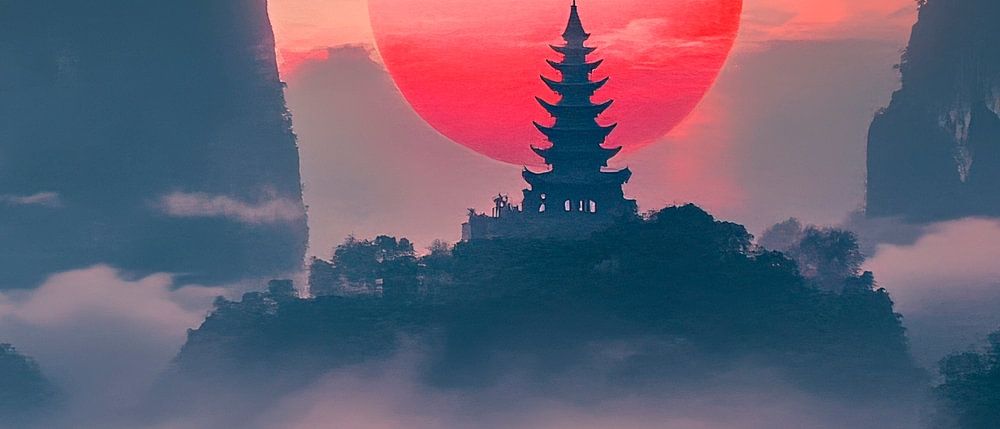 Te midden van een betoverend landschap schittert de majestueuze pagode tegen een felrode zonsondergang. Zachte nevelflarden omhullen de vorm van de bergen, terwijl een eenzame schipper harmonieus door het kalme wateroppervlak glijdt. Dit schilderij geeft een kalme, meditatieve sfeer aan elke woonkamer en nodigt uit om te ontspannen.