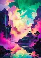 Onder een hemel geschilderd in magenta, groen en goud staat een eenzame figuur naast een glinsterend meer dat gevoed wordt door een trapsgewijze waterval. De lucht fonkelt van magie en gloeiende planten wiegen zachtjes aan de waterkant. Het hele landschap pulseert met leven, als een droom gevangen in de schemering.