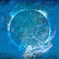 Een abstract schilderij in Scandinavisch minimalisme bestaande uit geometrische vormen en zachte penseelstreken op een elegante textuur in aangename blauwe kleuren.