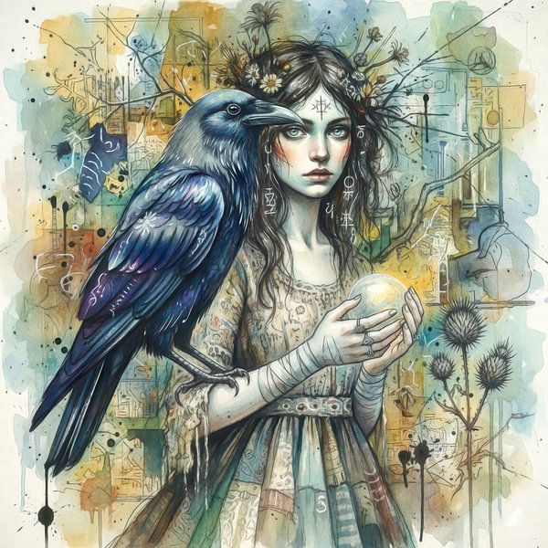 Een vrouw houdt een lichtgevende bol in haar hand, op haar arm zit een raaf. Haar kunstzinnige jurk en de achtergrond versterken de mystieke sfeer.
