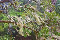 Dit expressieve natuurmotief voert je mee naar de mysterieuze sfeer van de bossen rond het Palácio Nacional da Pena in Sintra. De foto toont een tak begroeid met mossen en korstmossen die zich als een levend kunstwerk uitstrekt in de vochtige boslucht. Het weelderige groen van de bladeren contrasteert met de zilvergrijze sluier van het baardmos - een symbool van de fascinerende symbiose van leven en vergankelijkheid.