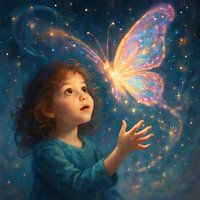 Een dromerig tafereel waarin een kind vol verwondering reikt naar een magische, lichtgevende vlinder die oplicht tussen sterren. Het werk ademt een sfeer van onschuld, verwondering en de kracht van verbeelding. De zachte penseelvoering en de kosmische gloed geven het geheel een sprookjesachtig en poëtisch karakter. Dit kunstwerk nodigt uit om weer even met de ogen van een kind naar de wereld te kijken – vol magie en oneindige mogelijkheden.