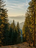 De lage, warme zon werpt een spectaculaire gouden gloed die door de hoge bomen filtert, waardoor een prachtig spel van licht en diepte ontstaat. De bomenlijnen vormen een natuurlijk en krachtig kader dat de blik leidt naar de glooiende, nevelige bergketens in de verte, typerend voor dit iconische Italiaanse berglandschap.