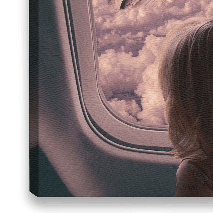 Koop de foto Magische Beeldbewerking: Meisje Kijkt Uit Vliegtuigraam en Ziet Vliegende Walvis Tussen de Wolken van Elianne van Turennout als print op canvas, aluminium dibond, (ingelijste) fotoprint, behang en ArtFrame. Voor jou op maat geprint in Fine-Art kwaliteit.