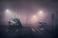 De combinatie van het onverwachte element van de dinosaurus en de onschuldige vreugde van het meisje dat in de regen speelt, creëert een ontroerend en memorabel beeld. De mist draagt bij aan de mysterieuze sfeer van de afbeelding, wat een dromerig en enigszins ongrijpbaar karakter geeft. Het lijkt alsof het tafereel zich afspeelt in een andere wereld, waarin alles mogelijk is en de grenzen van de verbeelding worden uitgedaagd.