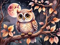 Deze afbeelding toont een schattige uil die rust op een tak onder een verlichte maan. Het werk combineert elementen van realisme met een vleugje fantasie, wat terug te zien is in de levendige kleuren en de bijna sprookjesachtige sfeer die het geheel uitstraalt. De zachte kleuren van de uil contrasteren mooi met de donkere, mystieke…